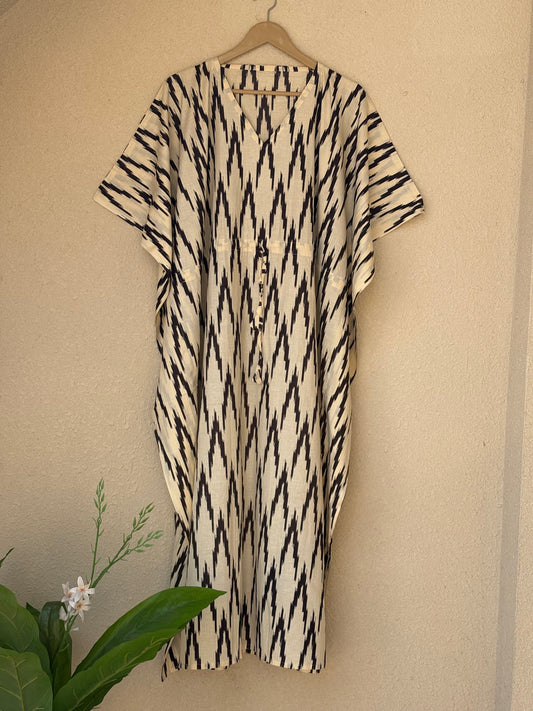 Hand Block Print Cotton Caftan With Waist Tie – Plus Size Resort Wear, Beach Cover Up, Loungewear Dress, Bohemian Summer Kaftan Mumus Ikat Printed