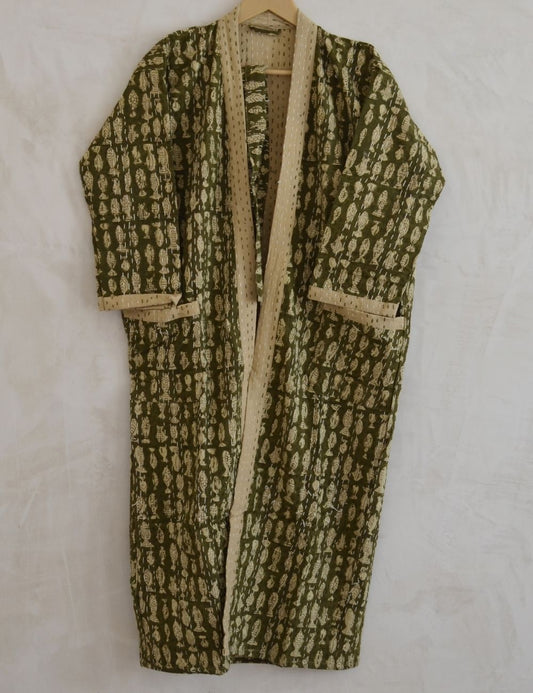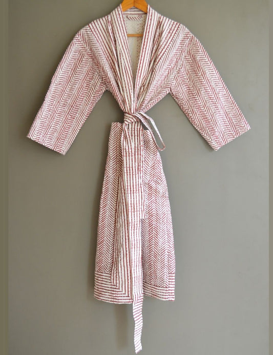 Indian Handmade Quilted Cotton Kantha Kimono Striped Print Robe
