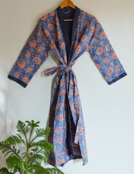 Floral Print Hand Block Cotton Kantha Quilt Kimono