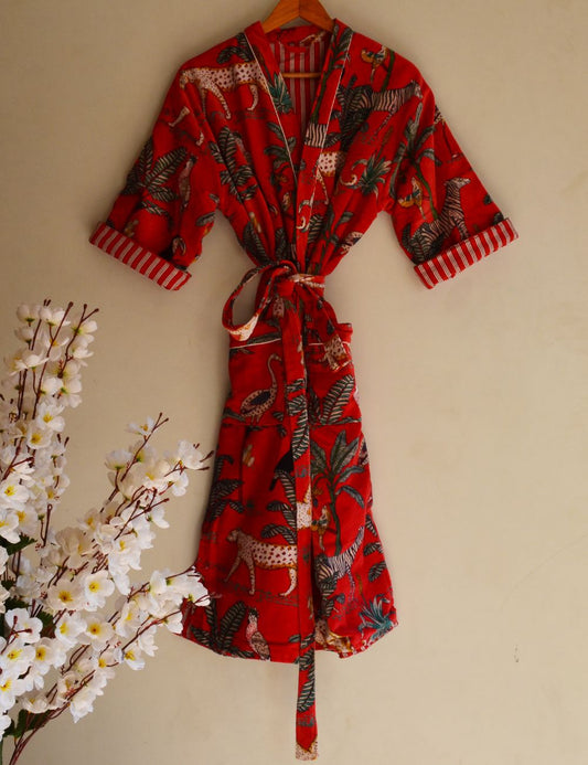 Red Jungle Print Velvet Kimono Morning Tea Velvet Coat Christmas Gift