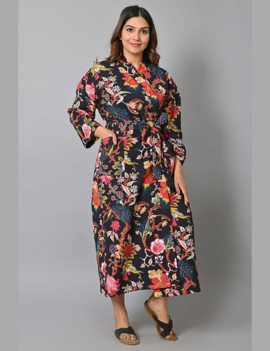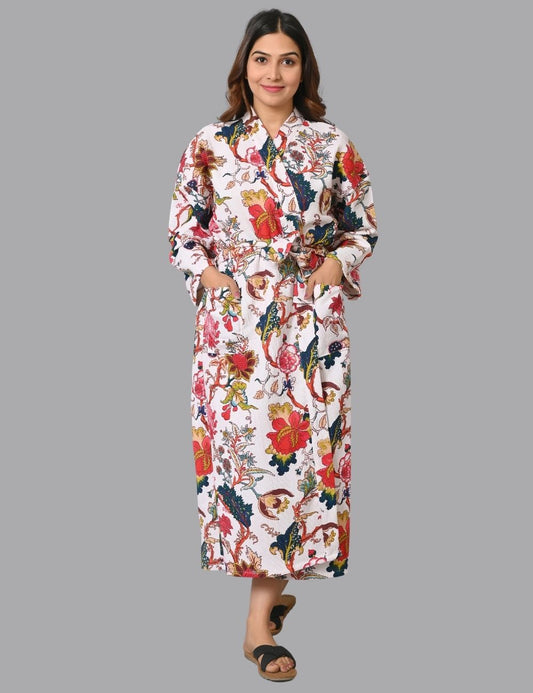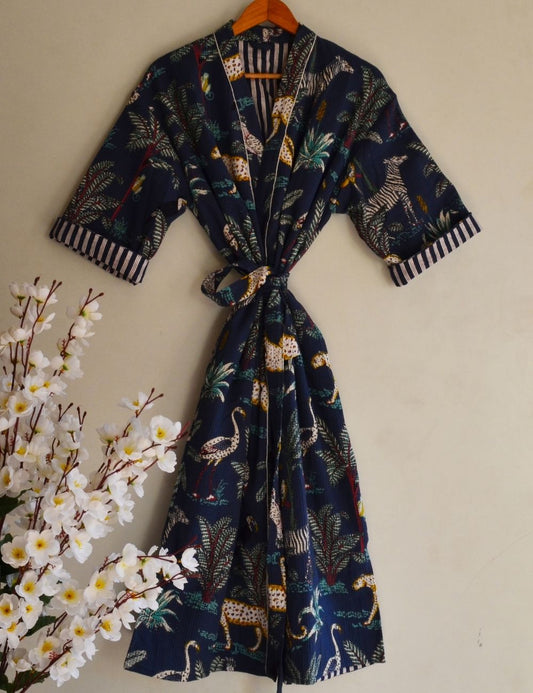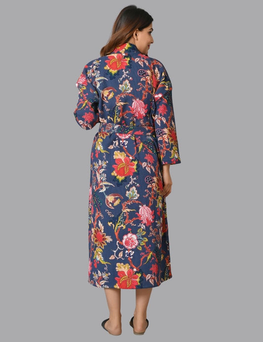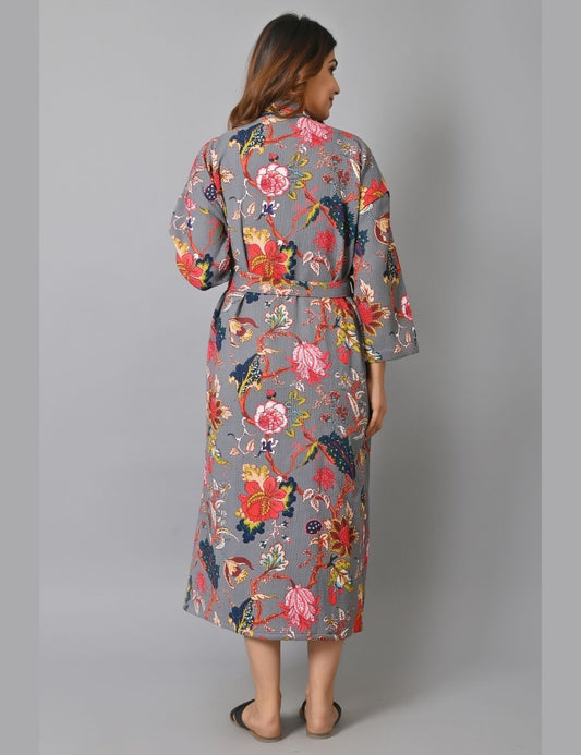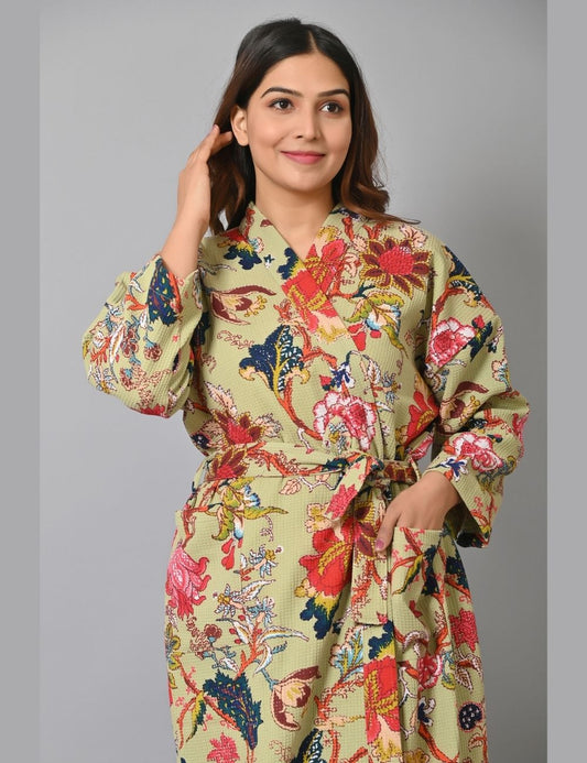 Pure Waffle Cotton Handprinted House Bath Robe Winter Kimono