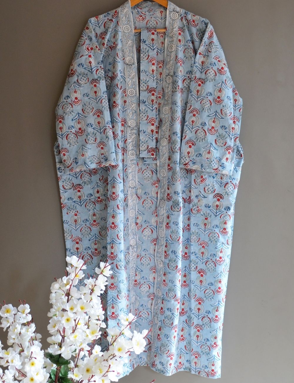 Indian block print cotton kimono made from hand block printed fabric. It is hand printed fabric using natural dyes. Cotton kimono robes are perfect for lounging around the home or spa. Use our block print robe as a cover up on the beach or after a dip in the pool. Add a luxe, boho feel to your bridal shower. Versatile, soft and luxurious, our 100% cotton kimono robes are printed with azo-free dyes.