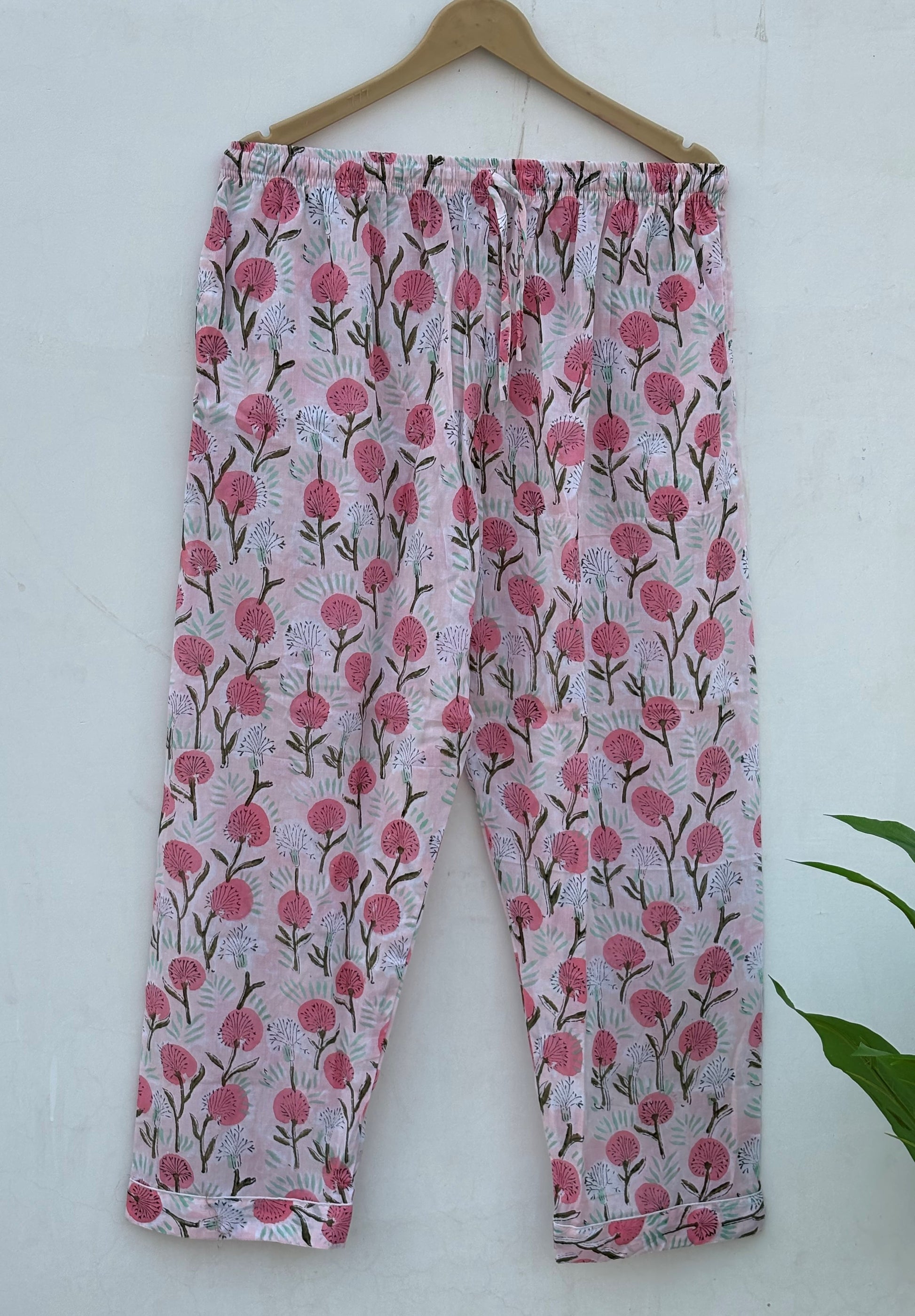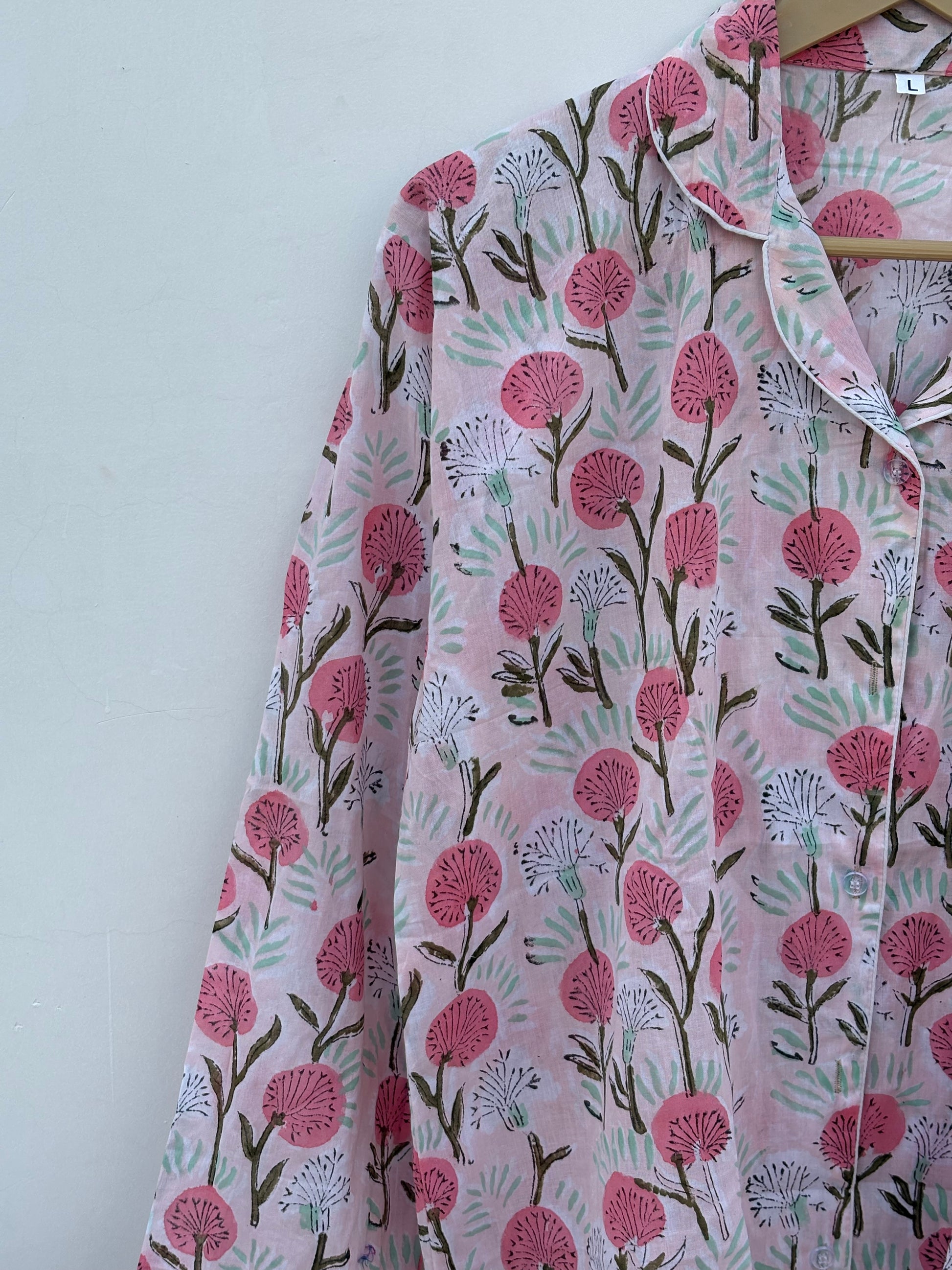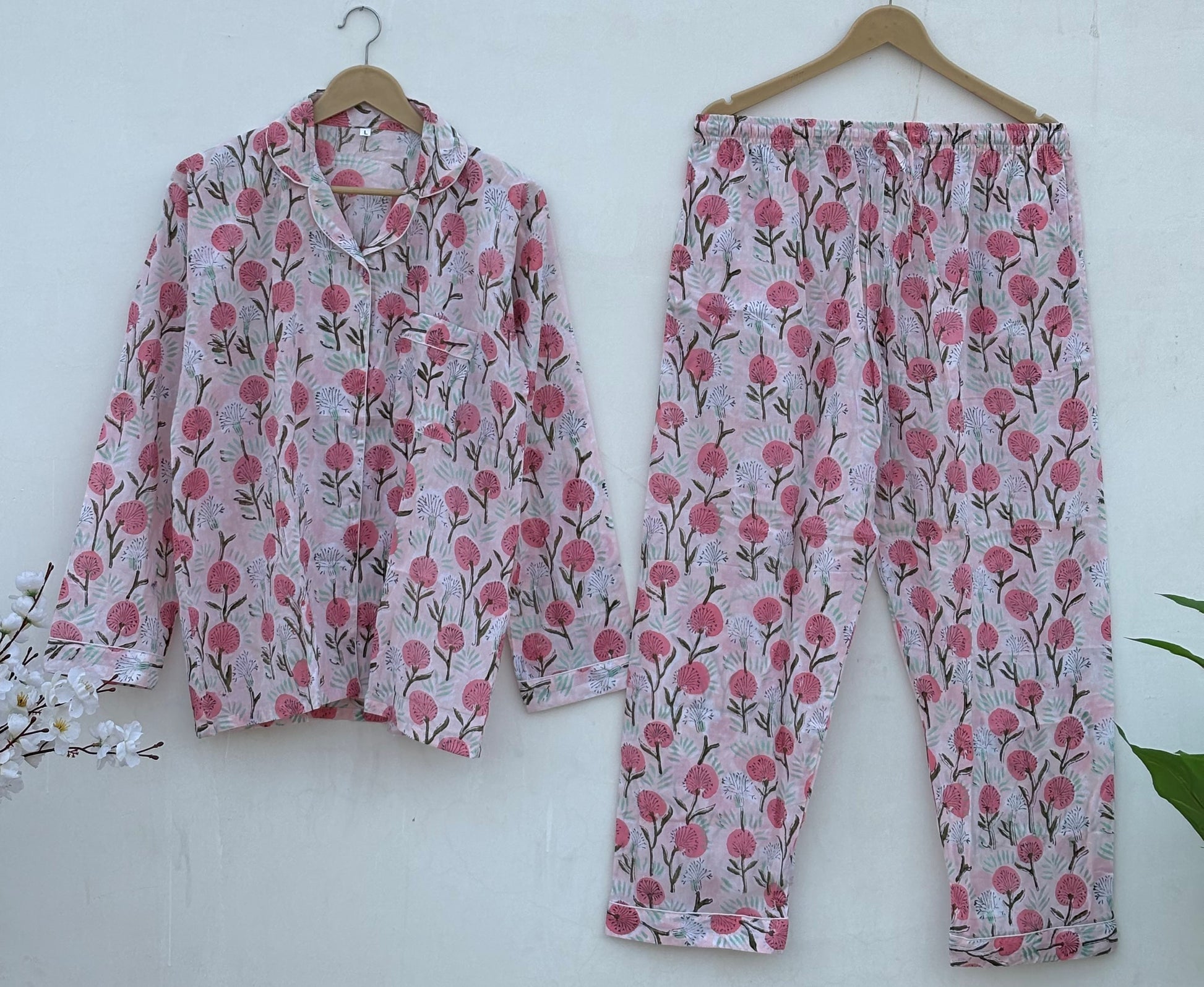 Block Printed Indian Handmade Pure Cotton Summer Pj Set For Long Sleeves Shirt With Pant And Pouch Night Dress