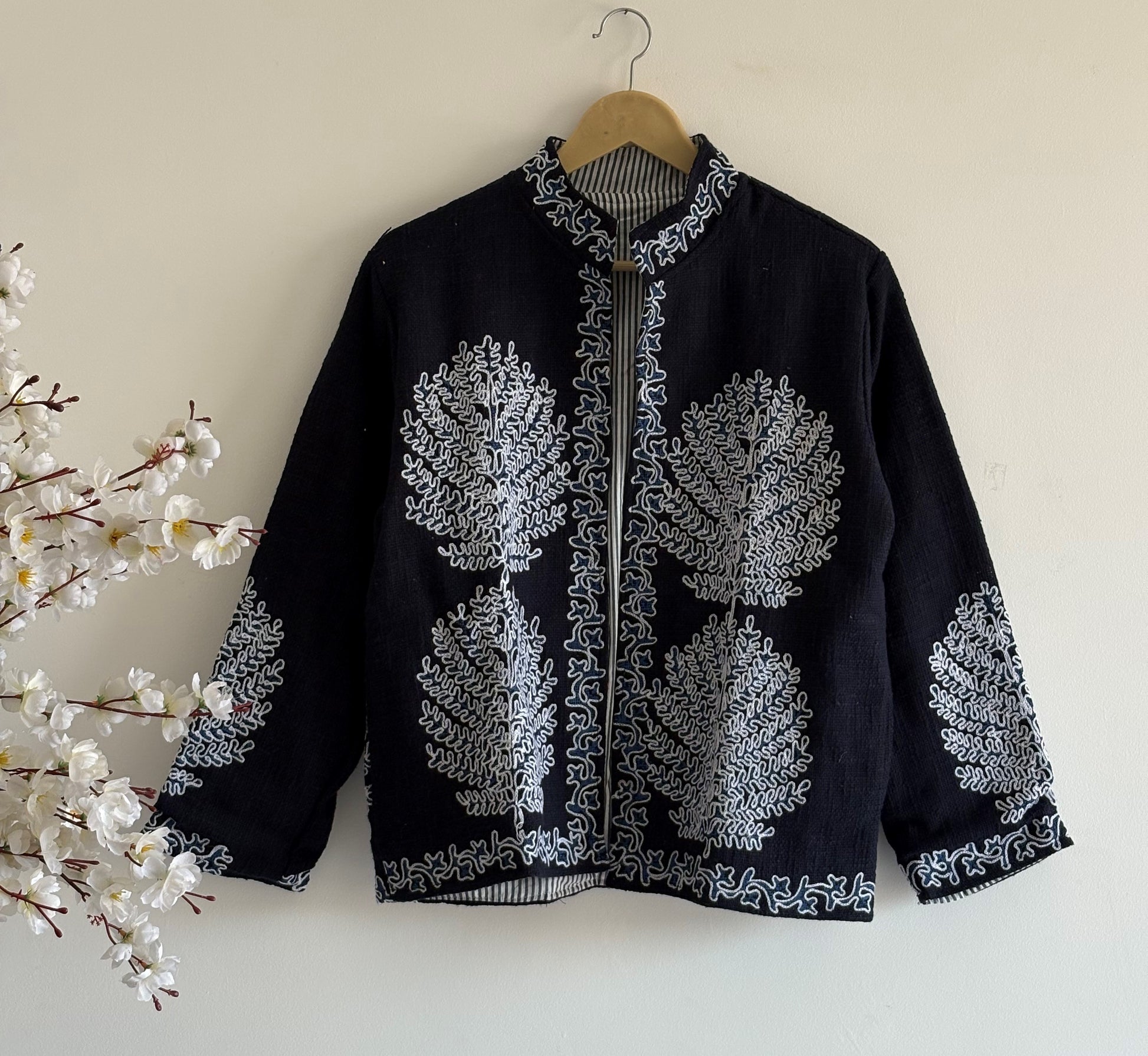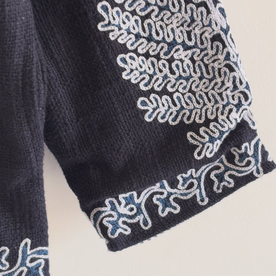 Step into elegance with our Handcrafted Black and White Suzani Jacket. This isn't just a piece of clothing; it’s a wearable piece of art. Inspired by the rich heritage of Central Asian "Suzani" embroidery, this jacket features bold, swirling floral motifs meticulously stitched onto a premium textured white cotton base.