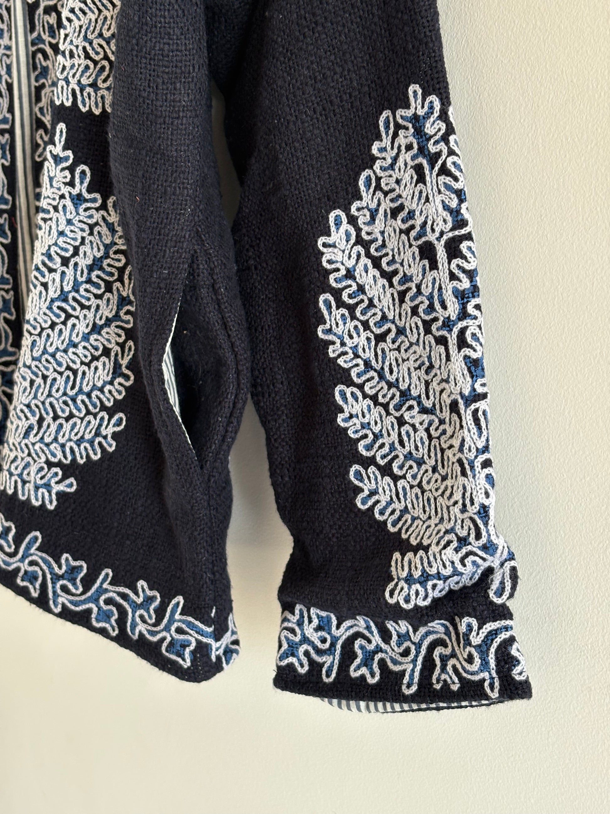 No two jackets are alike! Every piece features a unique combination of floral, paisley, and geometric embroidery, making it a wearable piece of art. The vibrant patterns and earthy tones bring a boho-chic flair to any outfit.