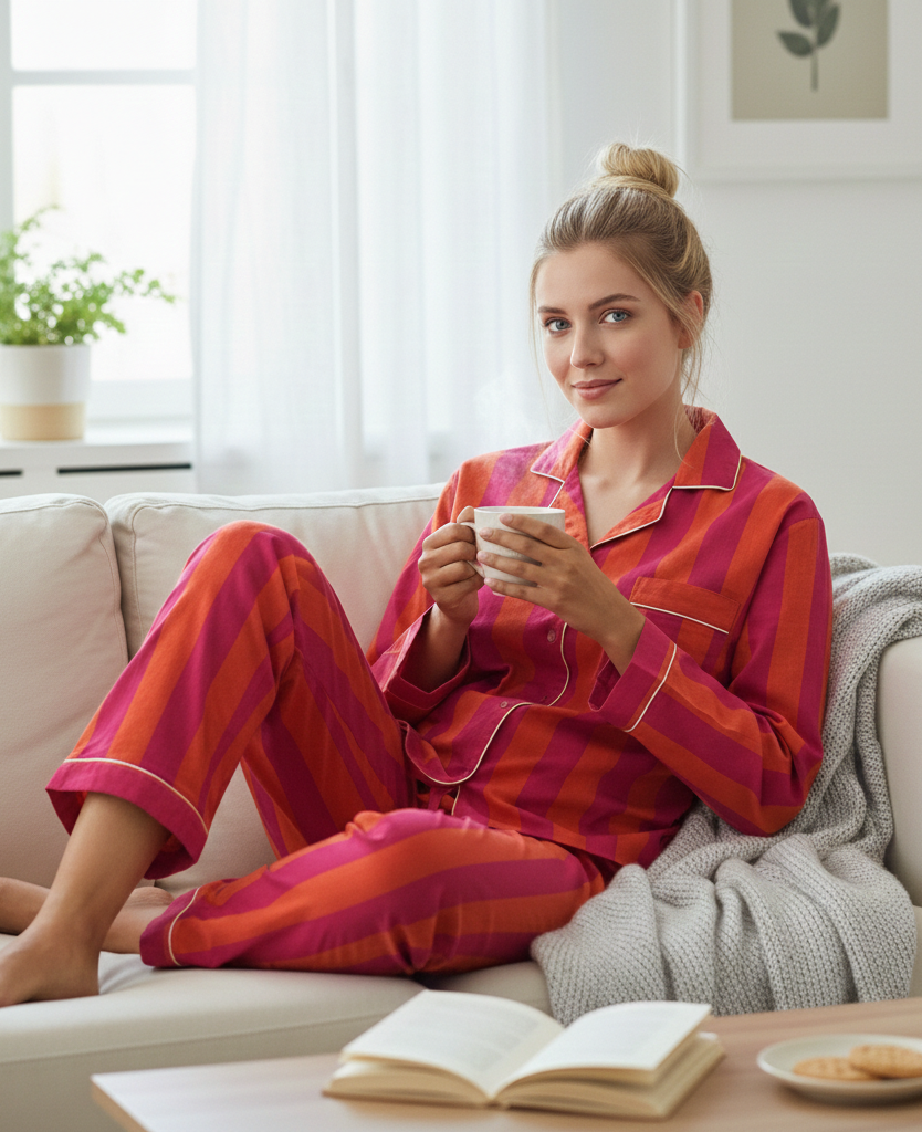 This pajama set is the perfect blend of comfort and style, designed for your cozy nights or relaxed weekends. Made from a light and breathable 100% soft cotton fabric, this set will keep you feeling comfortable all year round.